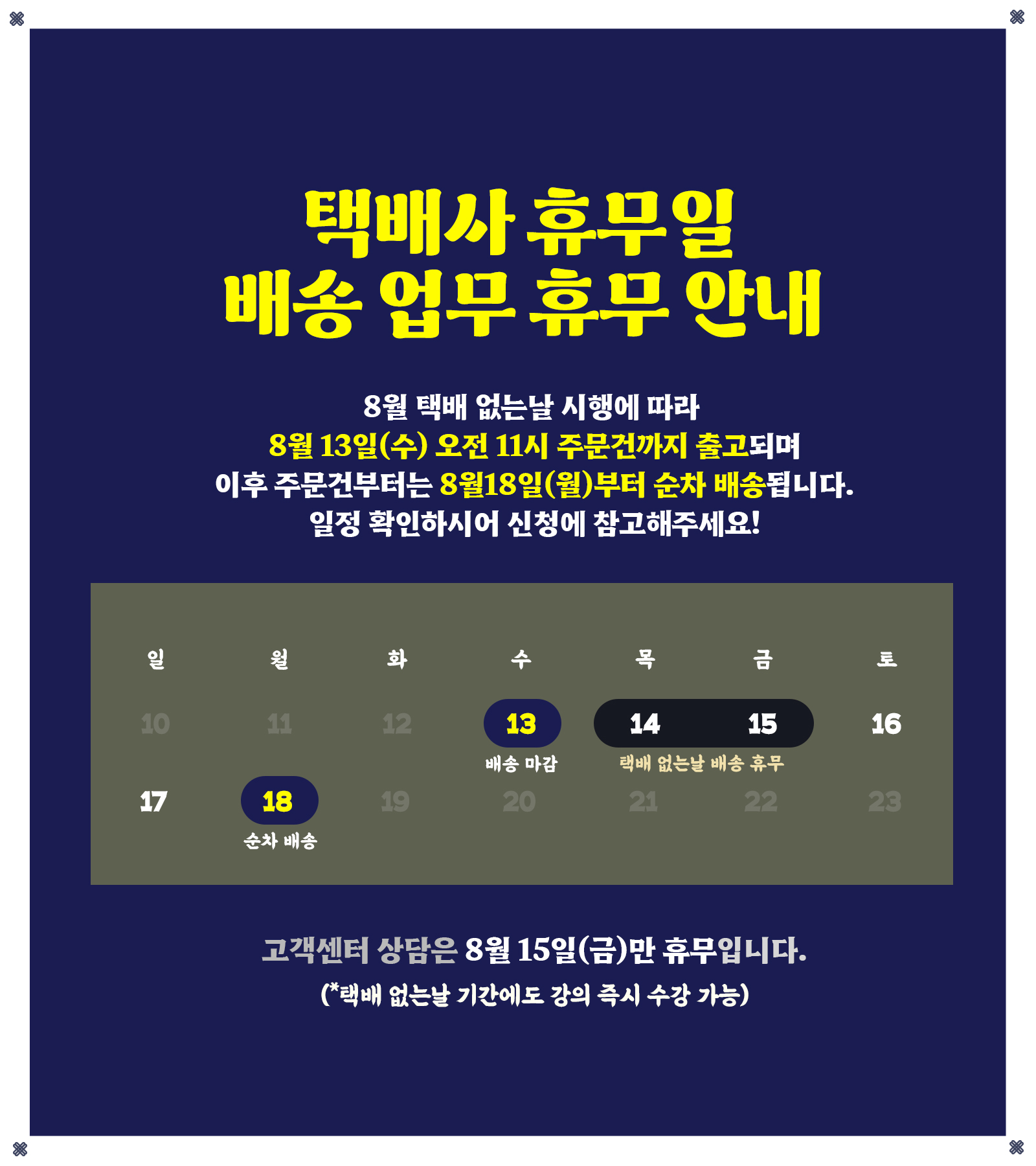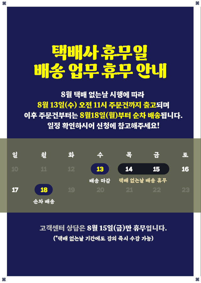 [필독 공지] 택배없는 날 (8월 14일~15일) 배송 및 고객센터 운영 안내