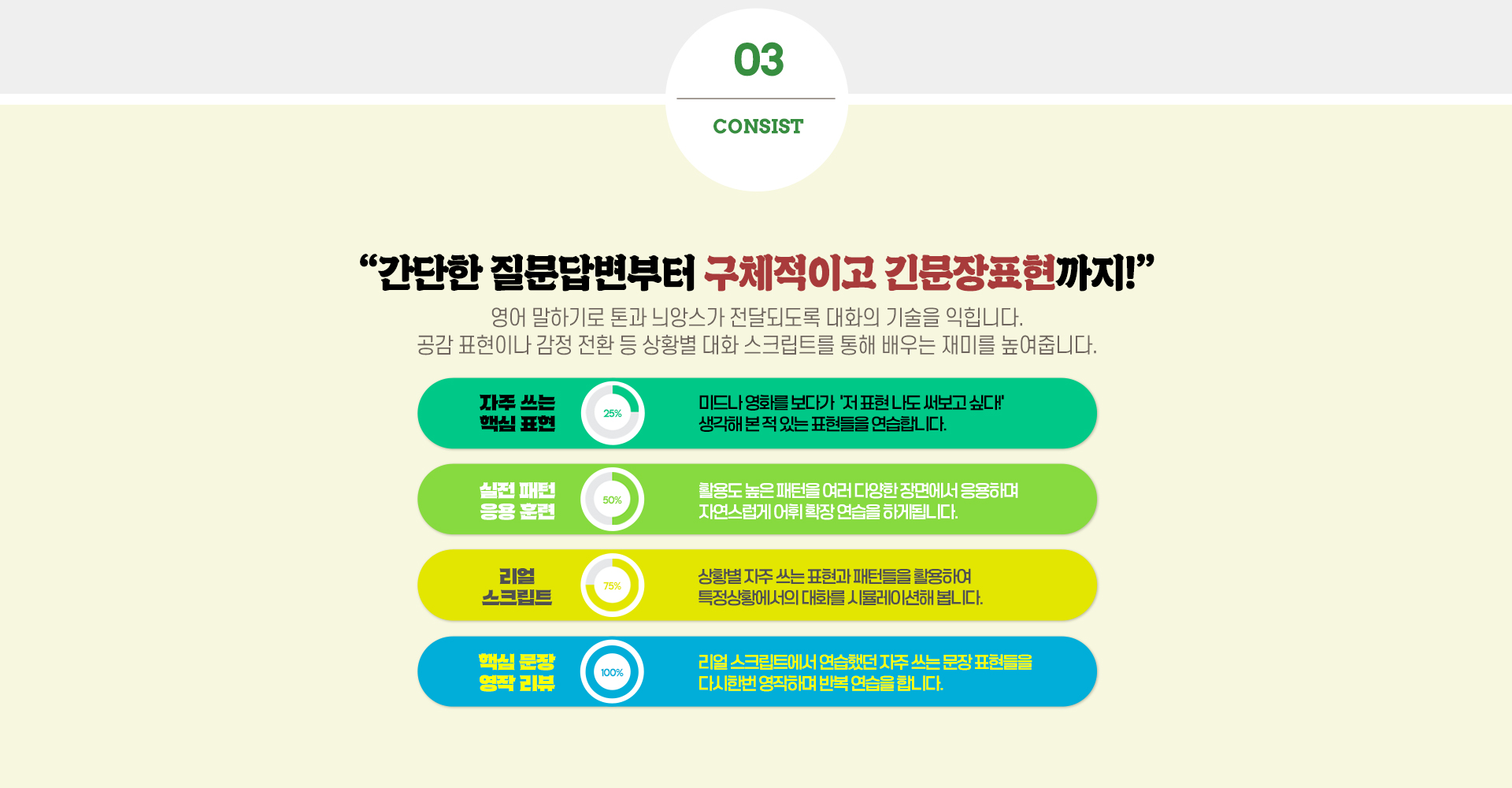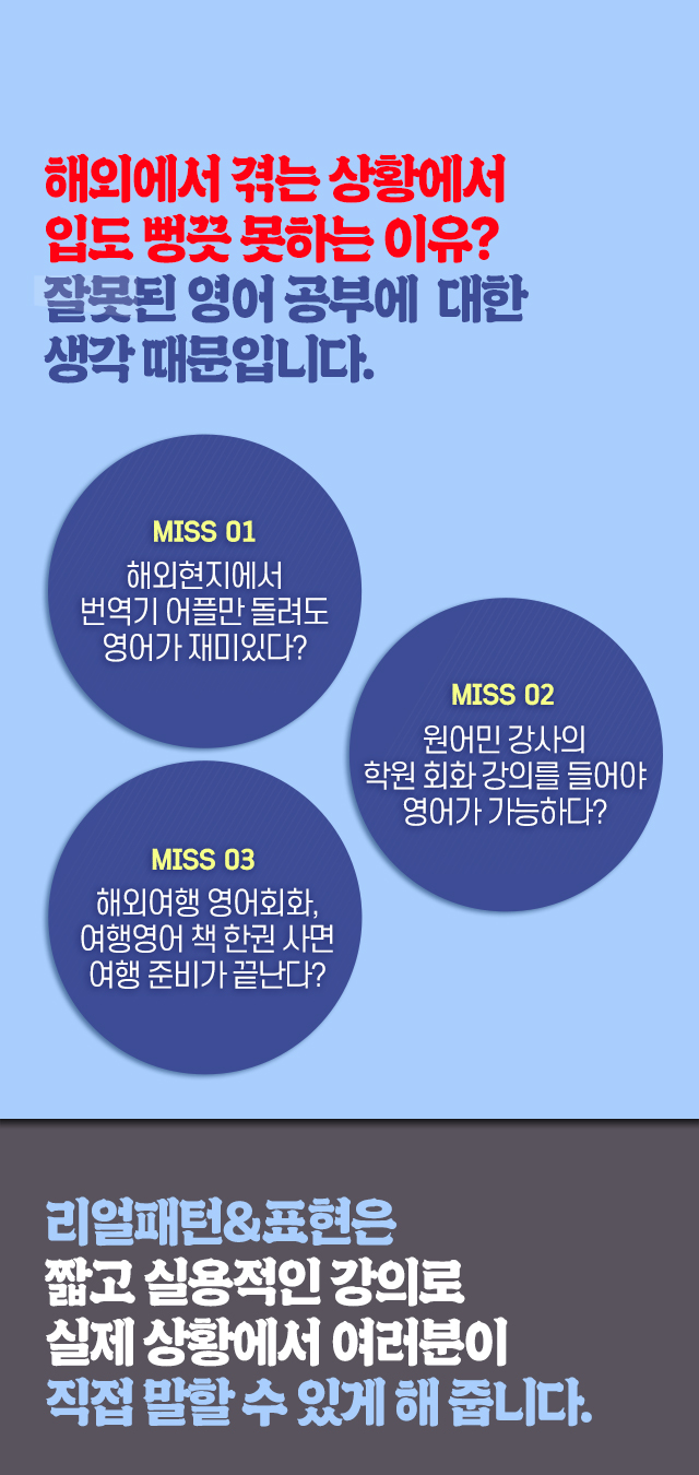 최정*강의 듣기 시작한지 이제 2달쯤 된 것 같아요. 애초의 각오와는 다르게 매일매일 듣고 있지는 못해요...그래도 강의 듣다보면 대화형태로 구성되어 있다보니 이해하기도 쉽고 간단하게 적용되다보니 영어가 생각보다는 쉬운데?라는 생각도 들어요.^^재미있다보니 포기하지 않고 남은기간동안 꾸준히는 들을 생각이에요.강좌명은 리얼패턴이지만 패턴뿐만 아니라 상황별로 쓸수 있는 표현들도 함께 구성되어 있어서 너무 좋은 것 같아요. 지금도 상황별로 많이 강의가 있지만 앞으로도 계속해서 업데이트 해주시면 너무 좋을 것 같아요.