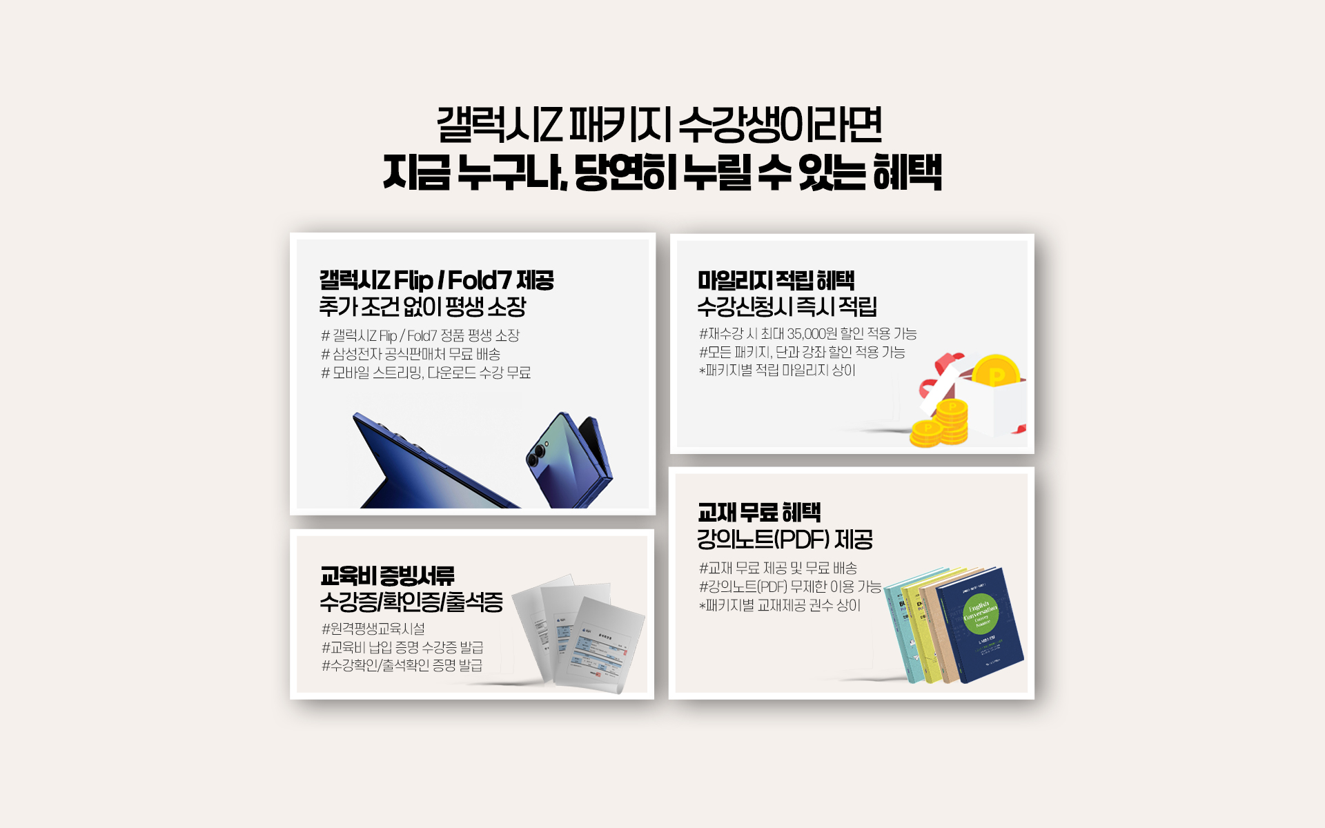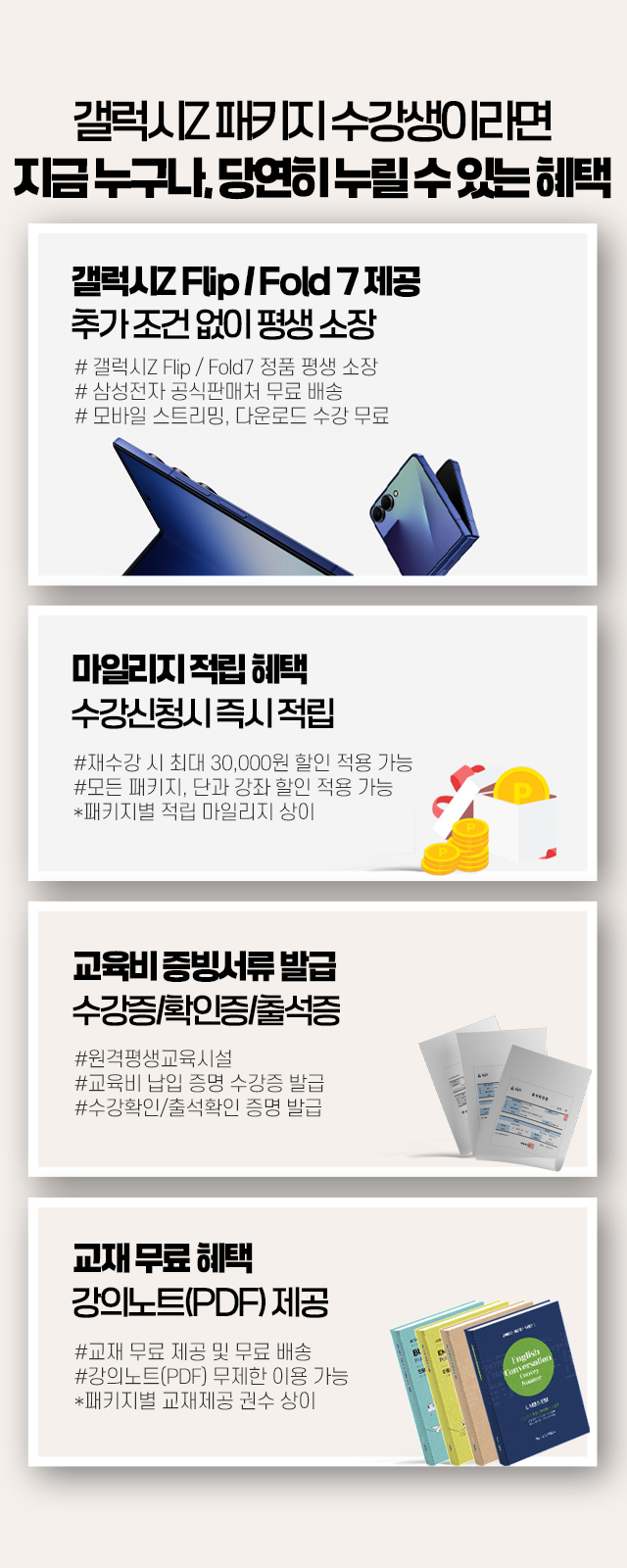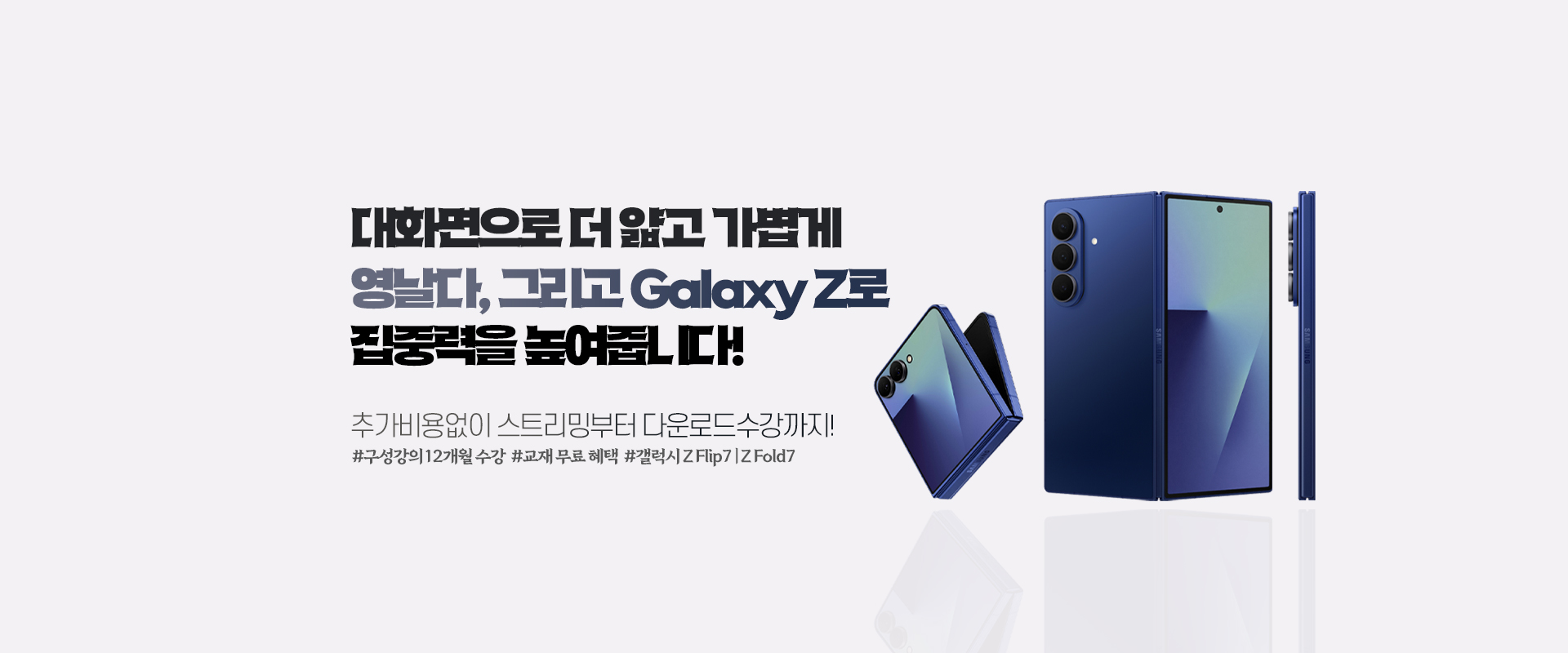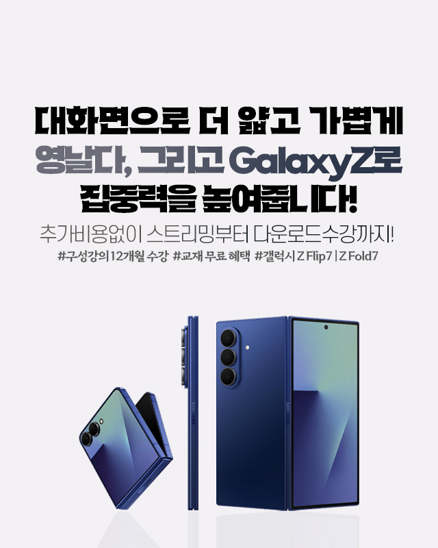 갤럭시Z 패키지는 기기에 강의가 내장되어 발송되지 않고 학습기간 동안 자유롭게 스트리밍, 다운로드하여 수강하는 상품입니다.